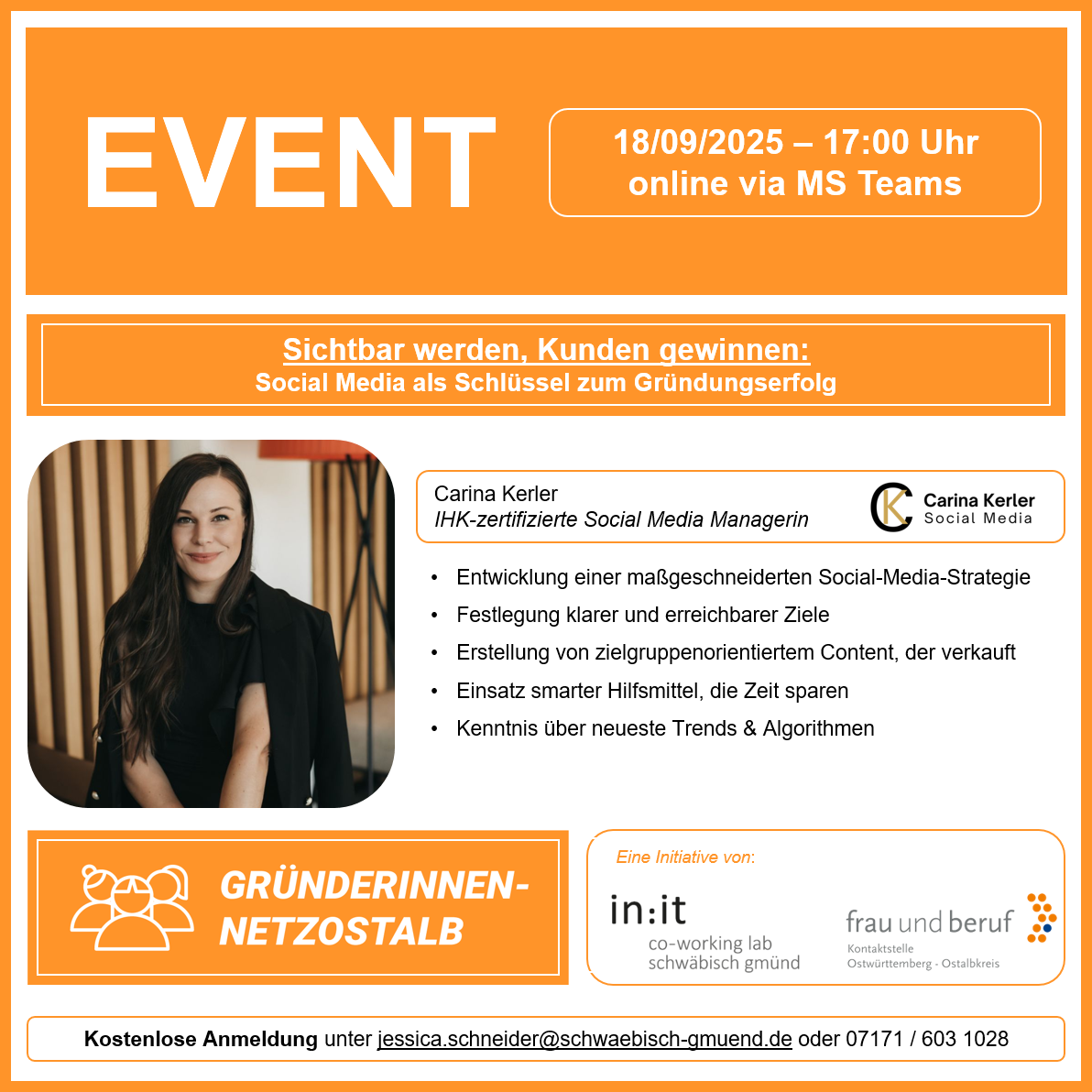 INFO: Die Veranstaltung ist Teil der Initiative GründerinnenNetzOstalb. Das Netzwerk wurde von der Kontaktstelle Frau und Beruf Ostalbkreis und dem in:it co-working lab ins Leben gerufen, um Frauen auf ihrem Weg in die Selbstständigkeit zu unterstützen, ihnen eine Plattform zu bieten und den Austausch zwischen Gründerinnen in der Region zu fördern. Die zentralen Ziele des Netzwerks sind Networking, Wissensaustausch, Community-Support, Präsentationsmöglichkeiten und Information.